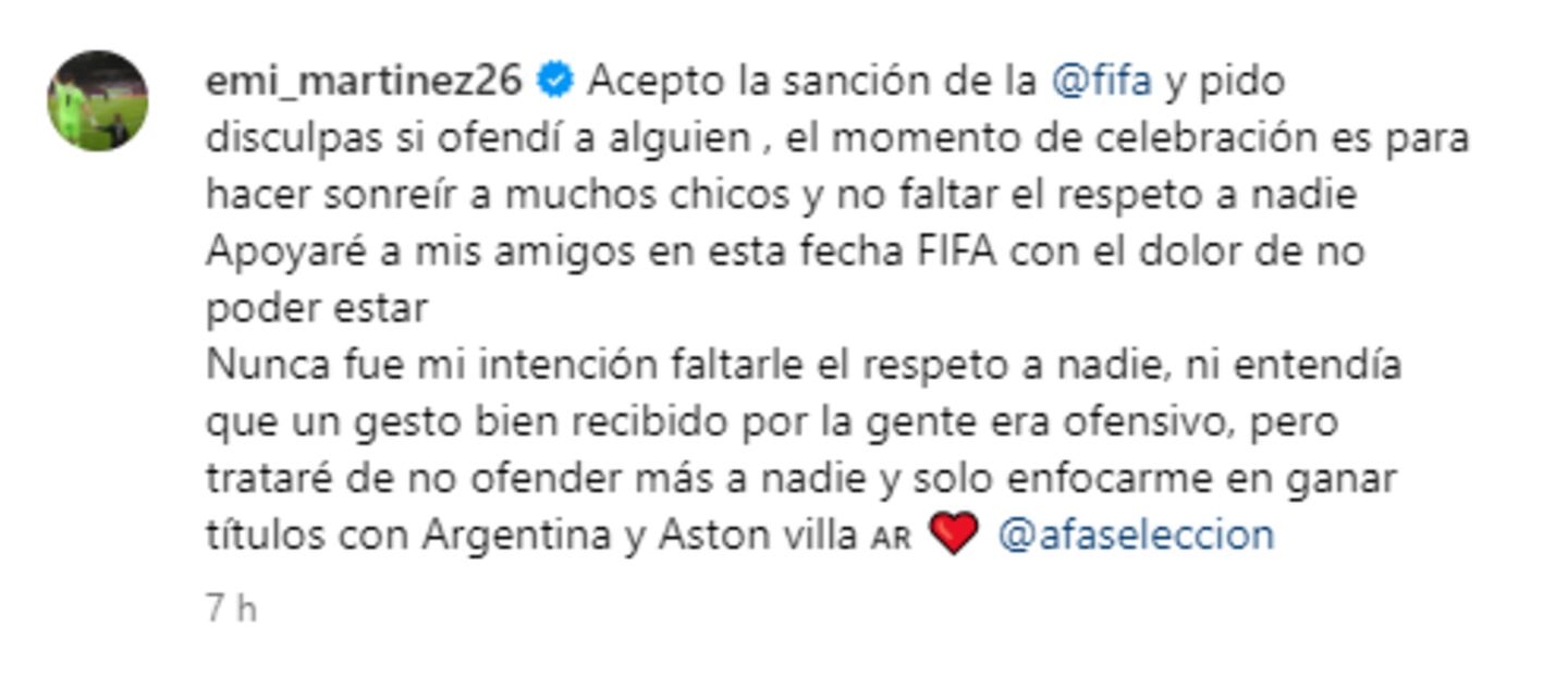 “Acepto la sanción de la FIFA y pido disculpas si ofendí a alguien, el momento de celebración es para hacer sonreír a muchos chicos y no faltar el respeto a nadie. Apoyaré a mis amigos en esta fecha FIFA con el dolor de no poder estar. Nunca fue mi intención faltarle el respeto a nadie, ni entendía que un gesto bien recibido por la gente era ofensivo, pero trataré de no ofender más a nadie y solo enfocarme en ganar títulos con Argentina y Aston Villa”, escribió. Enseguida tras el mensaje, el arquero sumó un corazón como emoji y arrobó a la cuenta de la selección argentina".
