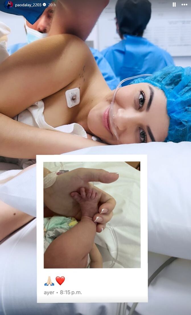 En la primera fotografía, Paola se muestra en la sala de parto, conectada a oxígeno y con una gorra quirúrgica. Junto a esta imagen, se incluye una pequeña foto del pie de su pequeña, a la que está sujetando con su mano. Esta última imagen circuló en las redes tras su llegada al mundo.