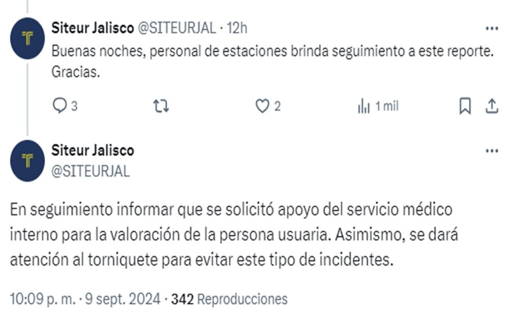 Tras el incidente, el Sistema de Tren Eléctrico Urbano informó en su cuenta de X que personal de las estaciones atendió el incidente.