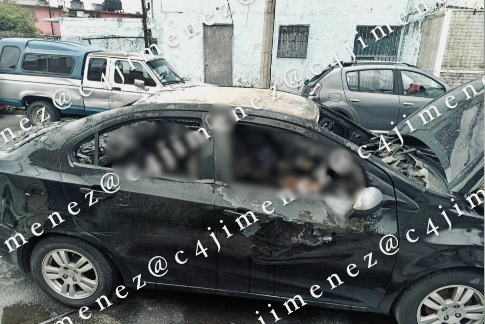 El periodista Carlos Jiménez, conductor del programa C4 en Alerta, informó que la víctima sería un hombre identificado como "Marco A. F.", conocido como "El Tortas". La imagen compartida por Jiménez muestra el vehículo dañado por el fuego, con afectaciones visibles también en el techo.