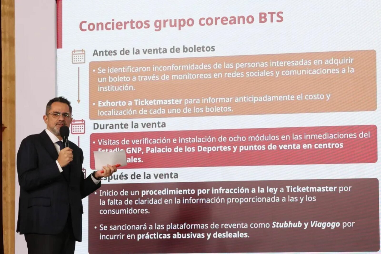Durante la conferencia matutina de la presidenta Claudia Sheinbaum Pardo, el procurador Federal del Consumidor, César Iván Escalante Ruiz, informó que Ticketmaster fue notificada el 28 de enero y enfrenta una multa superior a los 5 millones de pesos.