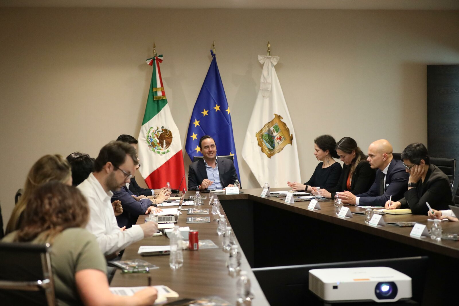 El gobernador Manolo Jiménez Salinas sostuvo una reunión de trabajo con integrantes de la Sección Económica y Comercial de la Unión Europea en México, así como con consejeros y consejeras económicos de 10 países de la región, con el objetivo de fortalecer la promoción de Coahuila como destino estratégico para la inversión europea.