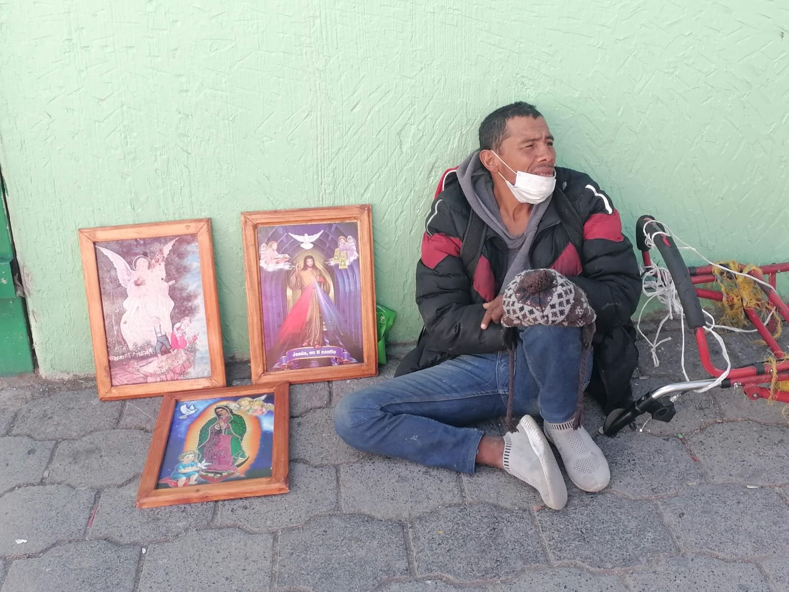 Pasó 14 años en prisión tras involucrarse en la delincuencia, ahora sobrevive elaborando y vendiendo cuadros religiosos afuera de la clínica 7 del IMSS.
