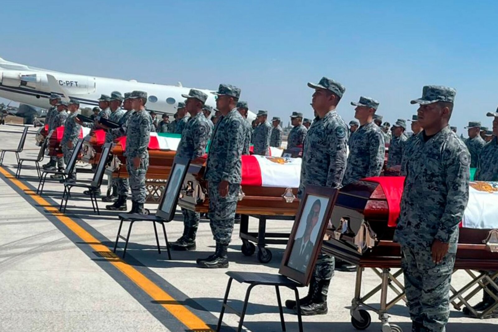 Los féretros llegaron en un avión militar y fueron cubiertos con la bandera de México, mientras personal de la corporación montó guardia de honor en memoria de los tres elementos caídos en Tapalpa, el domingo por la mañana.